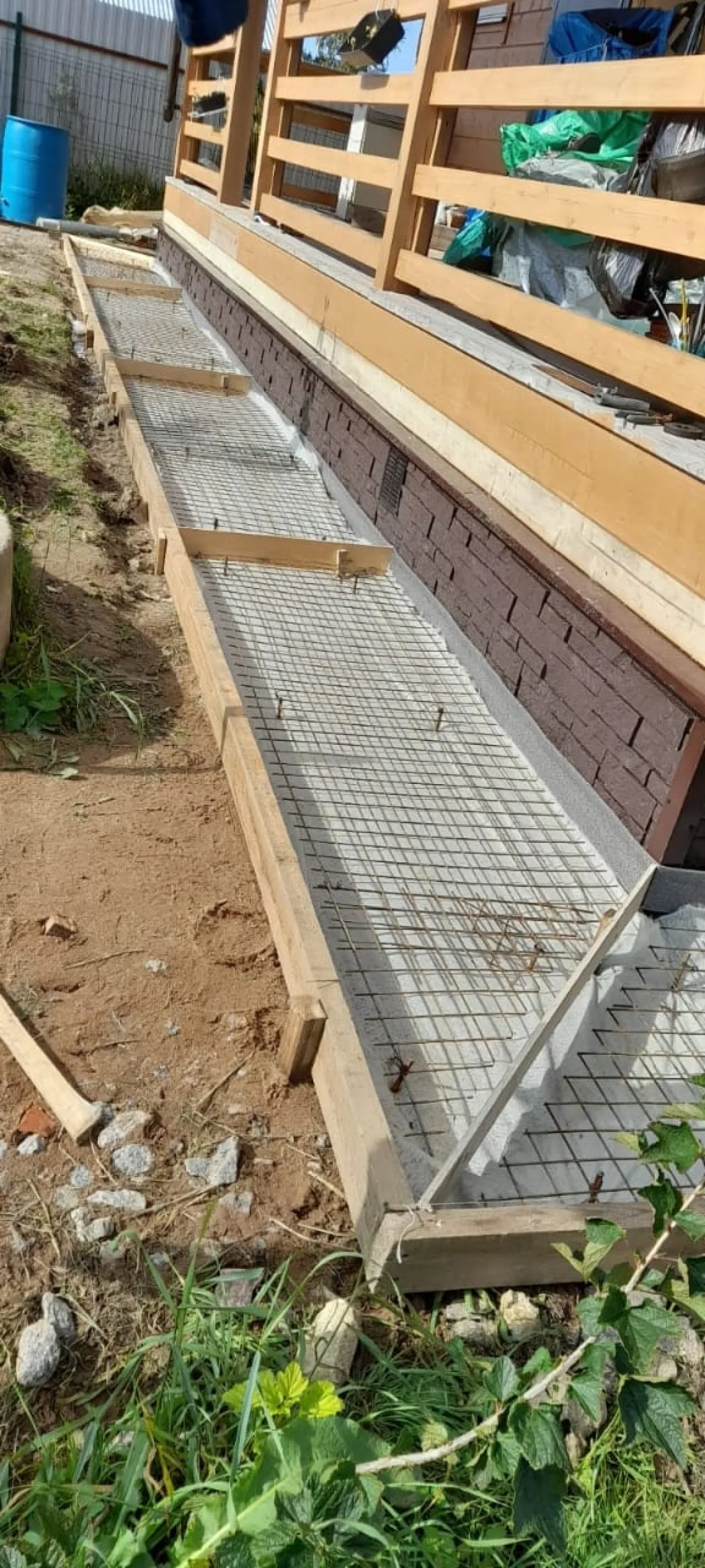- Чистовая отделка: Выполнена установка опалубки и армирующей сетки. Залита стяжка из бетона марки не ниже М200 (В15) толщиной 10 см с обязательным армированием и устройством деформационных (температурных) швов. Сформирован устойчивый уклон от здания (примерно 3-5°). Поверхность зажелезнена для повышенной износостойкости.