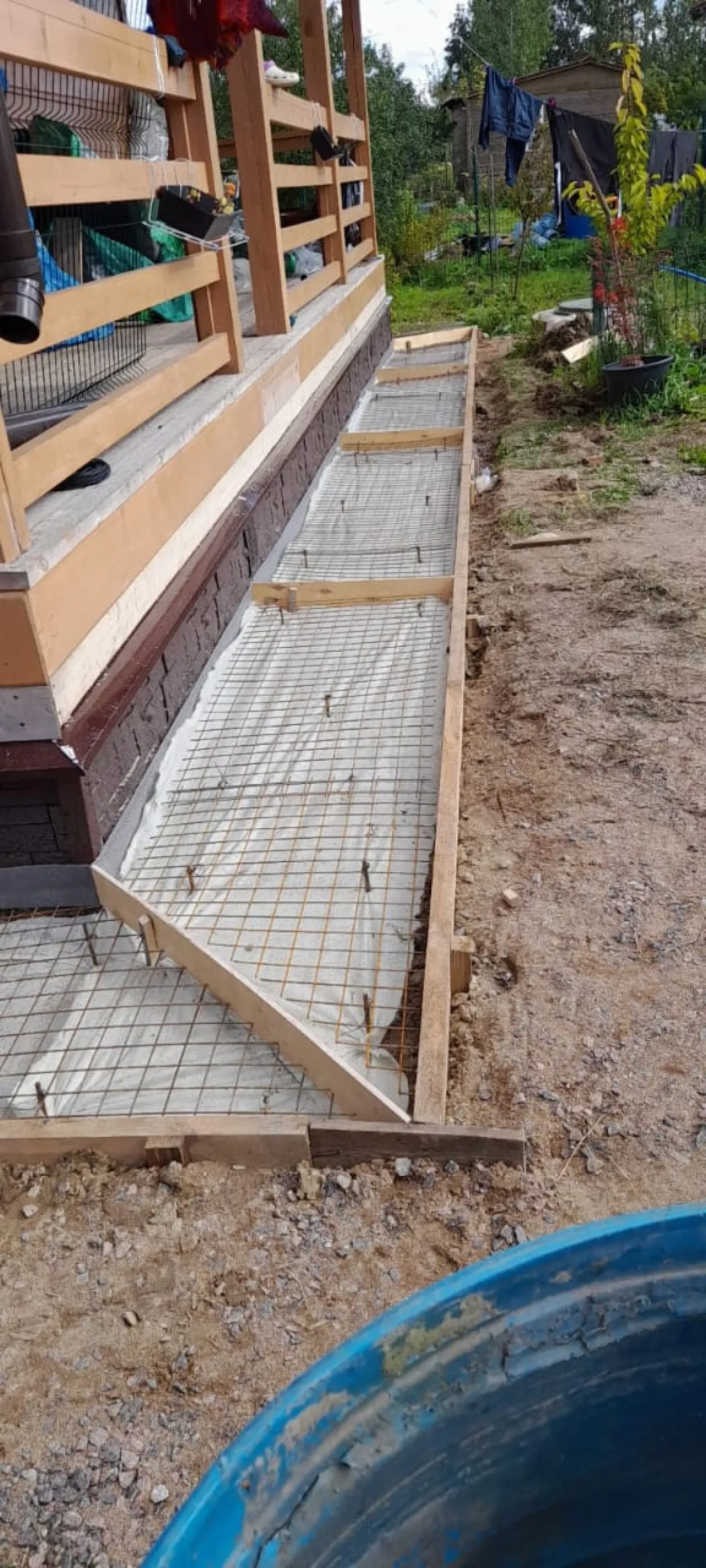 - Подготовка основания: По всему периметру дома (приблизительно 28 погонных метров) был выкопан котлован глубиной 30-40 см с соблюдением уклона от фундамента. Основание тщательно утрамбовано.